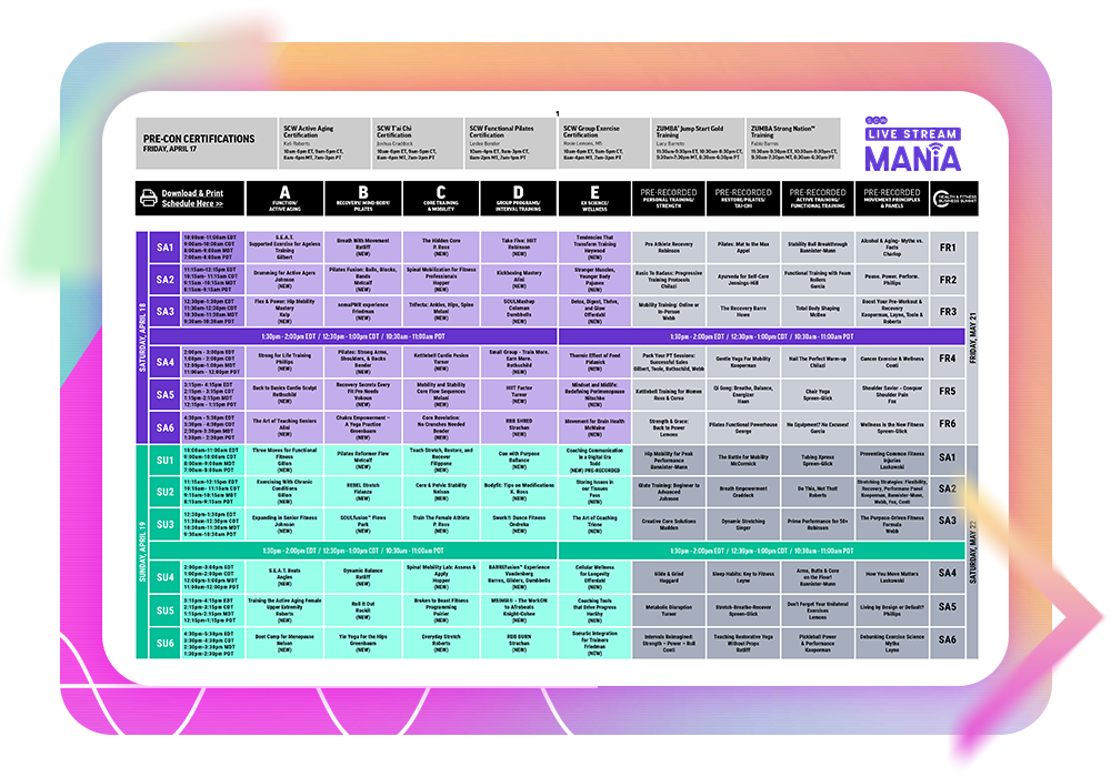 Join us for 108 sessions @ Live Stream Mania® on April 18–19! This fully virtual event gives fitness pros the chance to earn CEC/CEUs and gain expert education directly from industry leaders without leaving home!