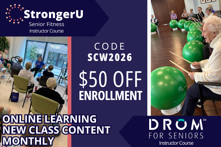 StrongerU Senior Fitness provides evidence-informed education and ready-to-use monthly class content that helps fitness professionals confidently deliver engaging, safe, and meaningful Cardio, Strength, Flexibility, Balance, and drumming-based mindfulness programming to older adults in a variety of settings.